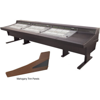 The mahogany 90 Series Workstation Desk for Three Digidesign C|24 Controllers from Argosy features a rack unit. The MDF-made chassis offers strength and durability, while the open design provides minimal acoustical influence, prevents thermal build-up and permits easy cable access. Behind the meter bridge is an enclosed utility area with easy access through detachable lids and back access panels.