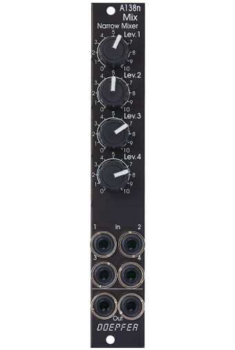 Module A-138n is a simple four channel mixer, which can be used with either control voltages or audio signals. Each of the four inputs has an attenuator available. The output is twice available (two sockets, hard-wired like a multiple).