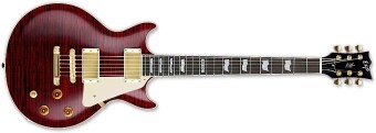 Kirk Hammett and ESP are celebrating 25 years of successful cooperation with three brand new KH signature models. This one, KH-DC is based upon the EC series models, but has a double cutaway, instead of a single one. This model was, along with other ESP novelties, exhibited at ESP booth at NAMM 2012. KH-DC starts off with a solid, double cutaway body made of mahogany back and flamed maple top. the carved top is bound in multiple layers of creme binding and has an elevated, white pickguard. See thru black cherry with glossy finish is the only color option available for this model. In the bridge department, Tonepros tune-o-matic bridge is paired with a stoptail bar. Both of them are plated in gold. Pickups for KH-DC are EMG81 active humbucker in the bridge and EMG60, also active humbucker in the neck position. To control and manipulate them, player has split volume controls, master tone and a three-way toggle switch. Neck on this Kirk Hammett model is made of mahogany and equipped with thin U contour and st-in joint. The fingerboard is made of rosewood with a set of 22 extra jumbo frets, flag position inlays and 1.6" wide bone string nut. 25-1/2" sale, Sperzel locking tuners and gold plated hardware complete the specs.