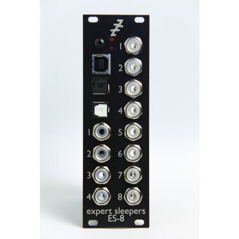 Expert Sleepers ES-8 is a USB 2.0 class-compliant USB audio interface in a Eurorack module with DC coupled inputs and outputs that can be used for both CVs and audio . As such, it is compatible with all popular computer-based CV generating programs and audio/CV processing iOS apps. The ES-8 also has one ADAT input and one ADAT output each. These Toslink optical jacks can be used to add additional inputs and outputs to the module or to use a traditional audio interface such as mic preamps or 1/4" line outputs. An expansion header on the back of the module allows the connection of an ES-5 Expert Sleeper, to which Gate, CV and MIDI Expander can be connected.