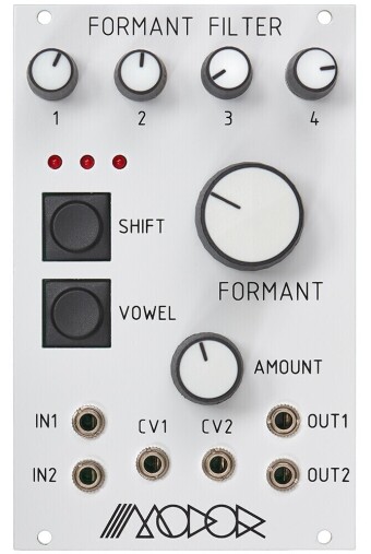 The big Formant knob is able to morph between three sets of formant frequencies (vowel): One is audible when the knob is turned completely to the left, the second one in the middle, and you will hear the third one by turning the knob completely to the right. This can be voltage controlled thanks to the CV inputs. The intensity of modulation is determined by the Amount potentiometer.
