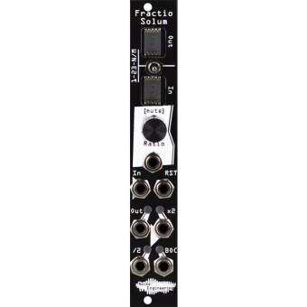 Fractio Solum is a simple and easy-to-use clock divider/multiplier. Patch a clock to the In jack, dial in a fraction with the encoder, and you’re off! CV over ratio opens up an extra level of clocking and sequencing power. Fractio Solum also includes a mute feature, a reset input, outs that further divide and multiply the selected ratio by 2, and a BOC output that outputs a trigger each time the division starts a cycle.