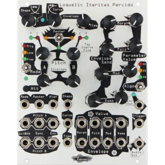 The Noise Engineering Loquelic Iteritas Percido (Silver) is. Synth-Voice Module for Modular Synthesizers in Eurorack Format. Similar to the small version Noise Engineering Loquelic Iteritas, Loquelic Iteritas Percido provides 3x Synthesis Types with Dual Frequency Control. The Sound is formed by 4x Parameters per Algorithm (Morph, Fold, Mod, Steam). Unlike the smaller version, Synth-Voice has. flexible AD Envelope with Trigger and Loop Modes that can control any number of parameters as required. Besides typical Synth Sounds, the Module is also suitable for powerful Drum Sounds. Also new are the significantly extended possibilities of CV Control.