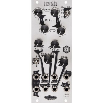 The Noise Engineering Loquelic Iteritas (Silver) is an Oscillator Module for Modular Synthesizers in Eurorack Format. It has 2x Digital Oscillators, one of which can be set as. Master by the Toggle Switch. However, the Module is not an ordinary Digital Oscillator, but rather. Comb Oscillator that offers Vocal Synthesis, Sum Synthesis and Phase Modulation with Variable Waveform.. Toggle Switch is also used to switch between the Synthesis Forms. For further processing of the sound, Wavefolder and the CV-Controllable Parameters Modulate, Morph, Damp and Pitch are available for both Oscillators.