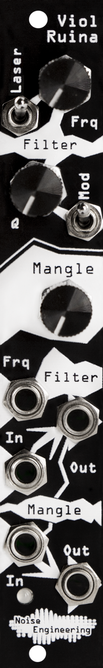 Viol Ruina is an all-analog distortion and lowpass filter with an internal envelope follower and self-modulating cutoff. The four-pole design is reminiscent of the classic filters we all know but with a completely new and slightly ridiculous twist. The independently addressable distortion circuit takes VR into overdriven paradise with a shocking amount of drive. Built-in envelope following makes an easy way to create dynamic patches with the flick of a switch, and feedback FM takes VR to a whole new realm of filthiness. Run a sound through VR, you’ll get something cool out of it.