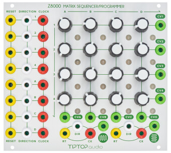 The Tiptop Audio Z8000 Matrix Sequencer is an incredible compact modulation sequencer that packs 10 CV sequencers and 16 rotary dials onto one board, measuring in at 28HP. Every sequencer on this board has its own CV output as well as its own Clock, Direction and Reset inputs, giving you complete control over your sequences. The Z8000 lets you design your own sequencing environment, allowing you to add logic gates, switches, triggers, clock sequencers and dividers to create your own personal system.